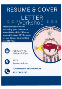 Need help updating your resume or cover letter? Join us at Siksika Employment & Training Services (SETS) for a free workshop where one of our Career Counsellors will assist you in building strong job application tools.