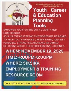 Come join us on November 19/25 from 4 to 6 pm for the Youth Career and Education planning tools session to gain the skills that can assist you with making informed decisions about your future. Call us at 4037345136 to reserve your spot. We look forward to seeing you!